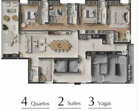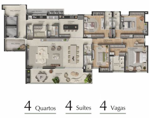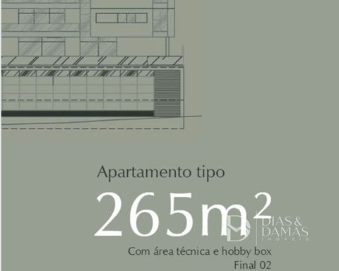 Opção 1 (apartamento tipo): 4 suítes e 4 vagas de garagem. 265m².