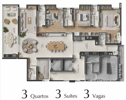 Opção 3 (apartamento tipo): 3 suítes e 3 vagas de garagem. 200m².