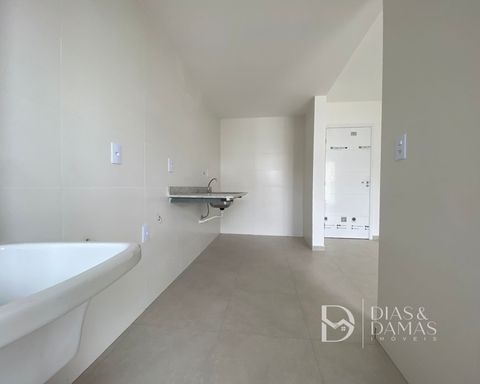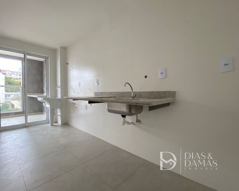 3 quartos (1 suíte), varanda gourmet, sala, cozinha com área de serviço e banheiro social. Duas vagas de garagem.